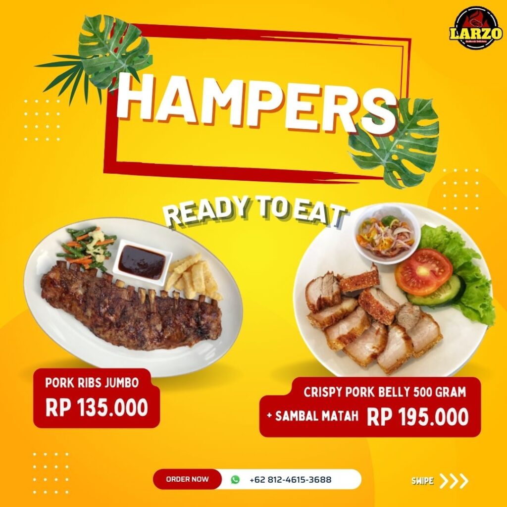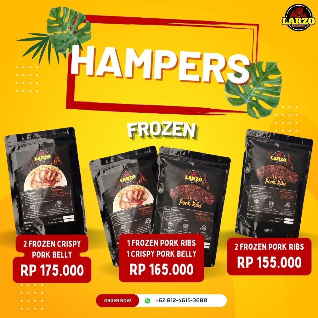 start from 35kLarzo Pork Ribs Mini Medium Large JumboDengan daging yang juicy dan bumbu racikan special! DOWNLOAD MENU DOWNLOAD MENU Order Online FROZEN FOOD Frozen Pork Ribs Frozen Crispy Pork Belly Price List Frozen Food Frozen Food Tersedia juga di HAMPERS Ready to Eat Frozen Pork Ribs ORDER HAMPERS